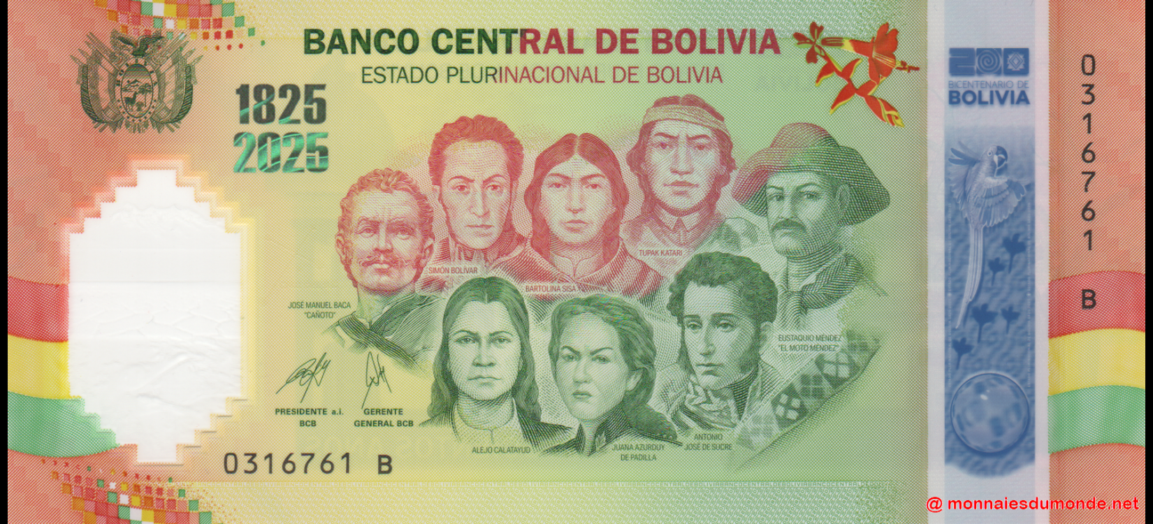 Au début du mois d’août 2025, la Banque centrale de Bolivie (BCB) a émis un billet commémoratif en polymère pour célébrer les 200 ans d’indépendance. Ce billet devait initialement avoir une valeur faciale de 200 bolivianos.