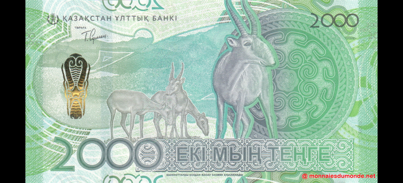 | Verso | Collines et lac ; antilopes saïgas (Saiga tatarica), bouclier ornemental stylisé |