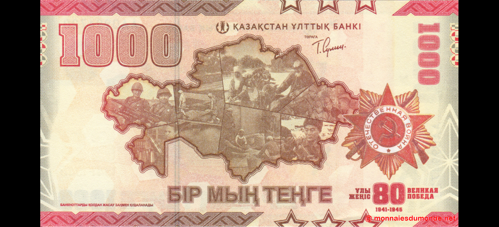 | Verso | Carte du Kazakhstan illustrée de scènes de soldats et d'ouvriers en temps de guerre |